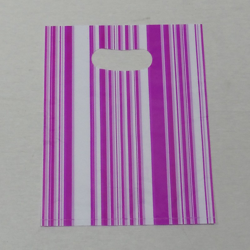 La bolsa de plástico es completamente recta en sus lados y dispone de un asa troquelada. Los bordes son lisos y están termosellados.