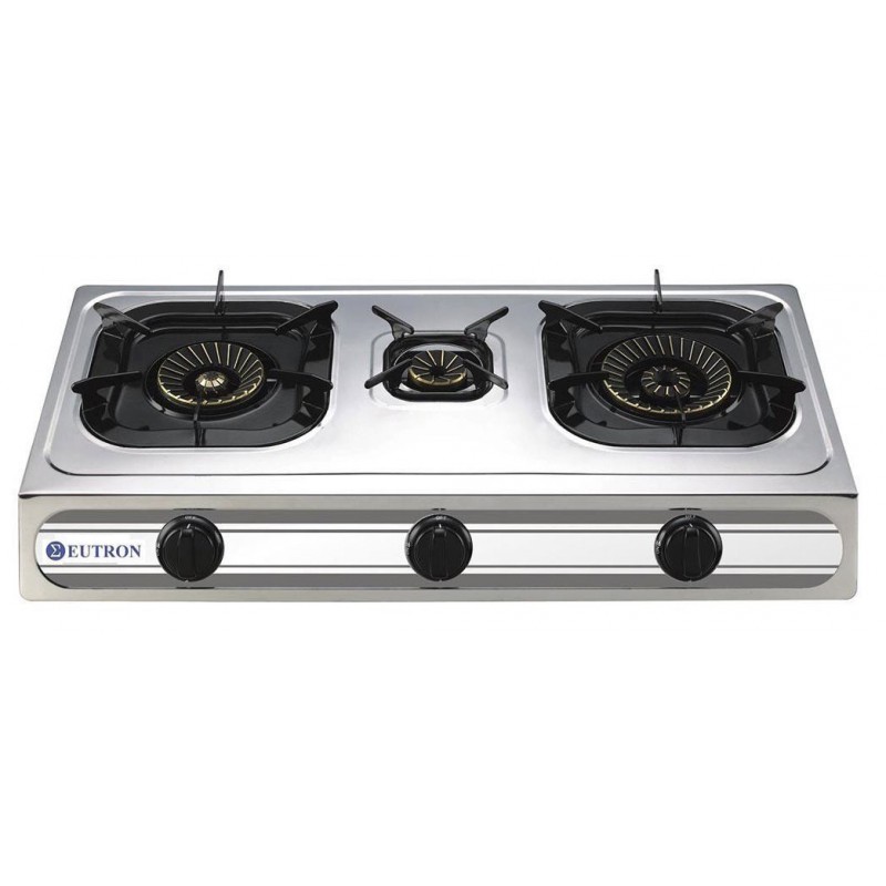 Cocina a gas (butano o propano) de sobremesa con 3 quemadores. Ideal para salidas al campo o espacios pequeños.