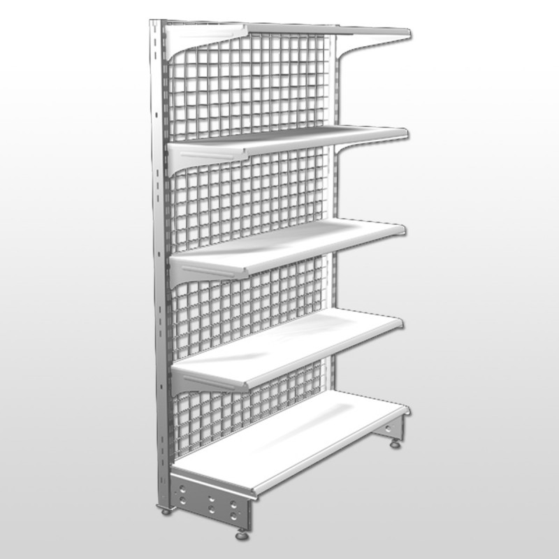 La estantería para comercio con fondo de reja está basada en nuestra estantería sencilla, pero presenta una reja trasera. Esta reja, además de evitar que los productos se caigan por atrás, ofrece la posibilidad de combinar las bandejas con ganchos para reja.