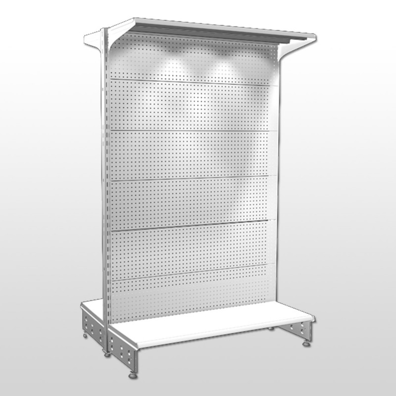 Una góndola de comercio con panel perforado trasero no es más que una estantería de comercio con panel perforado trasero y bandejas a ambos lados. Esta composición permite a los comercios aumentar la visibilidad de sus productos.