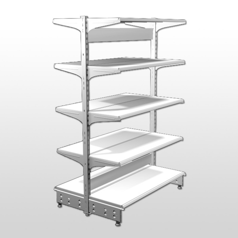 Una góndola de comercio sencilla no es más que una estantería de comercio sencilla con bandejas a ambos lados. Este tipo de composición es la más utilizada en los pasillos centrales de los comercios. Soporta unos 50 kg por bandeja.