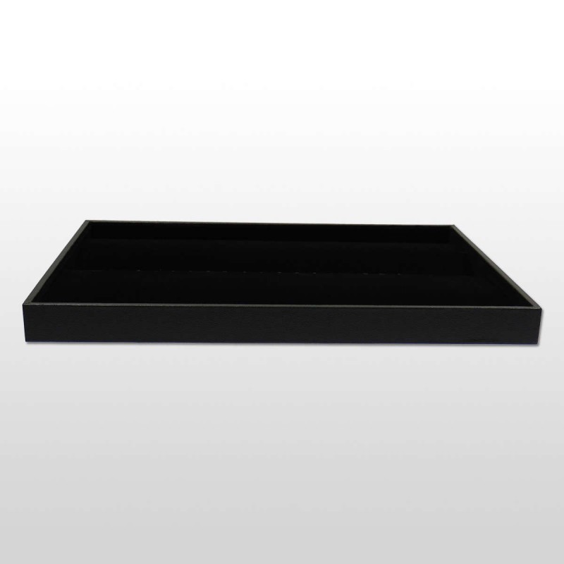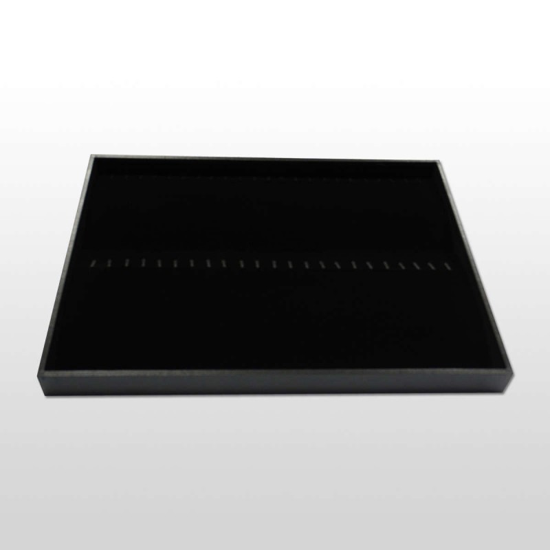 Bandeja para pulseras fabricada en madera. La parte exterior está forrada en símil-piel negra y la interior en terciopelo negro.