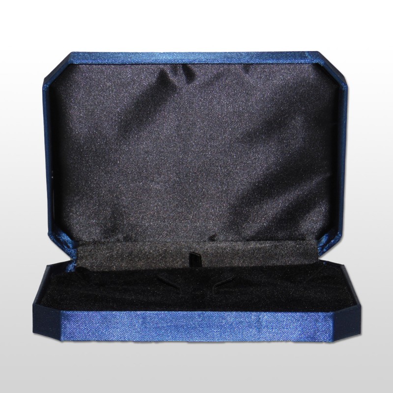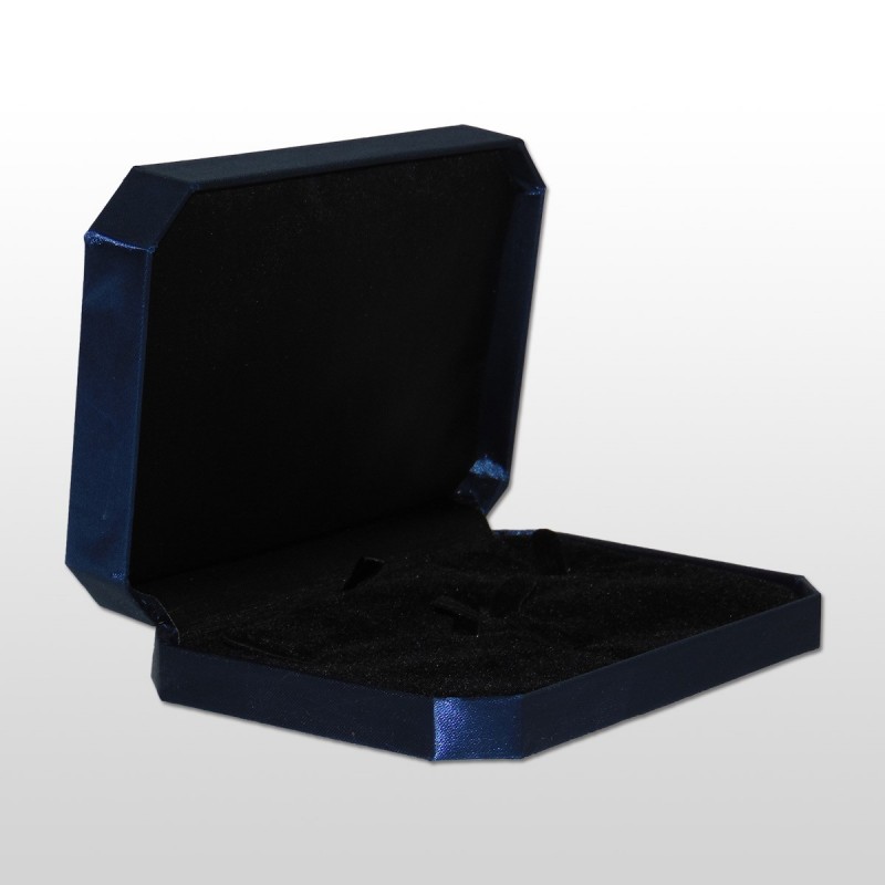 Caja para almacenar y exponer bisutería (colgantes, collares, pulseras, etc). La caja está fabricada en plástico y recubierta con tela y terciopelo azules.