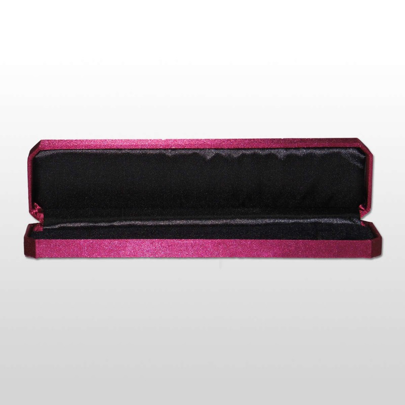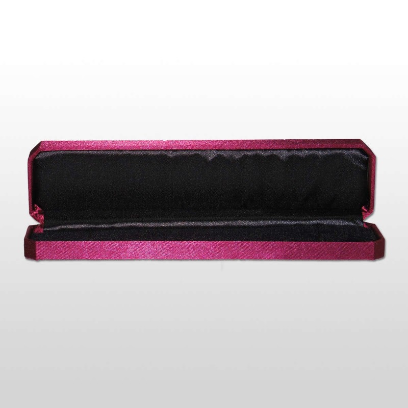 Estuche para almacenar y exponer pulseras. Está fabricado en plástico y recubierto de tela y terciopelo rojos.