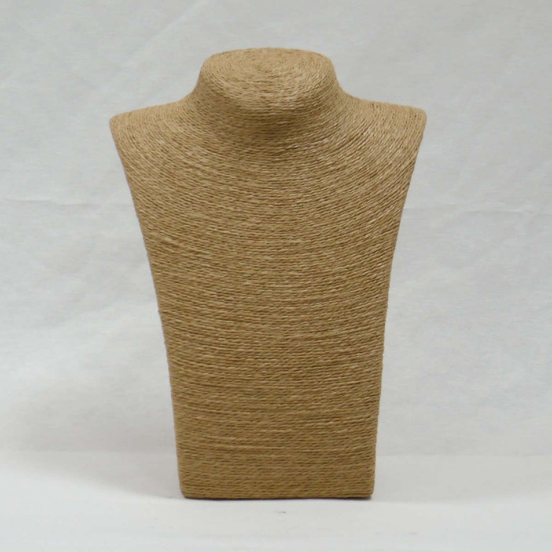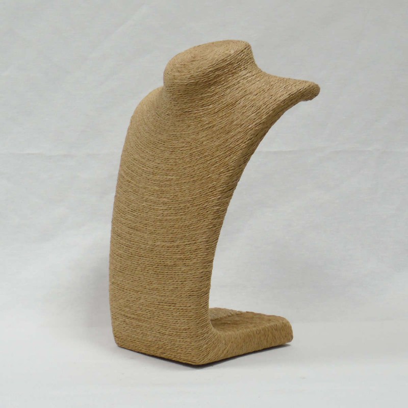 Este peto expositor pertenece a la nueva categoría de expositores con acabados en cuerda tipo esparto. Es un expositor original y muy elegante ideal para presentar collares de color oscuro.