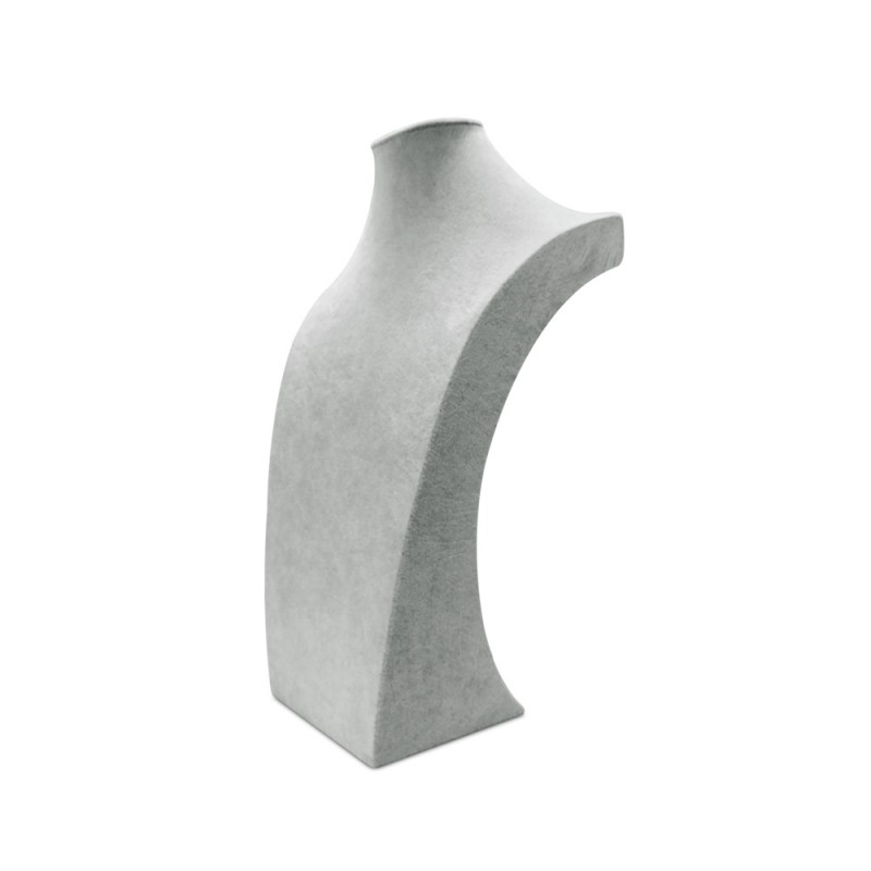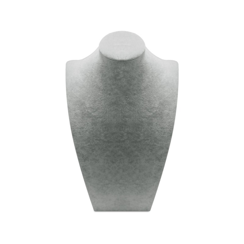 Peto expositor para collar con acabados en terciopelo gris.