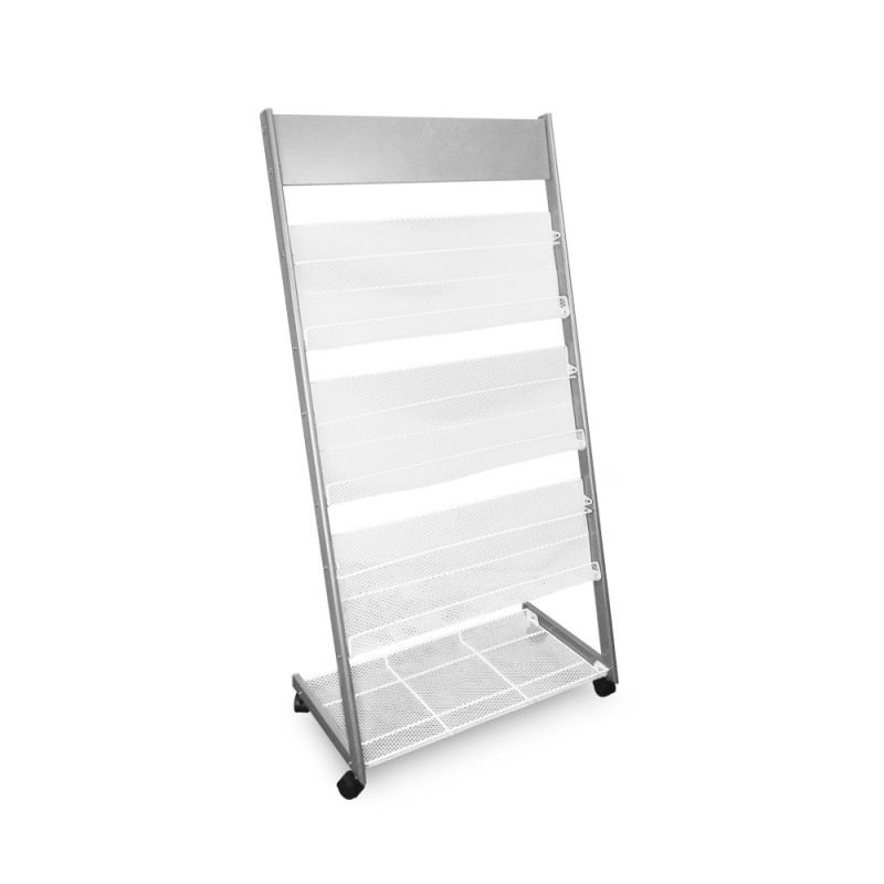 Expositor para revistas metálico en color gris y blanco.