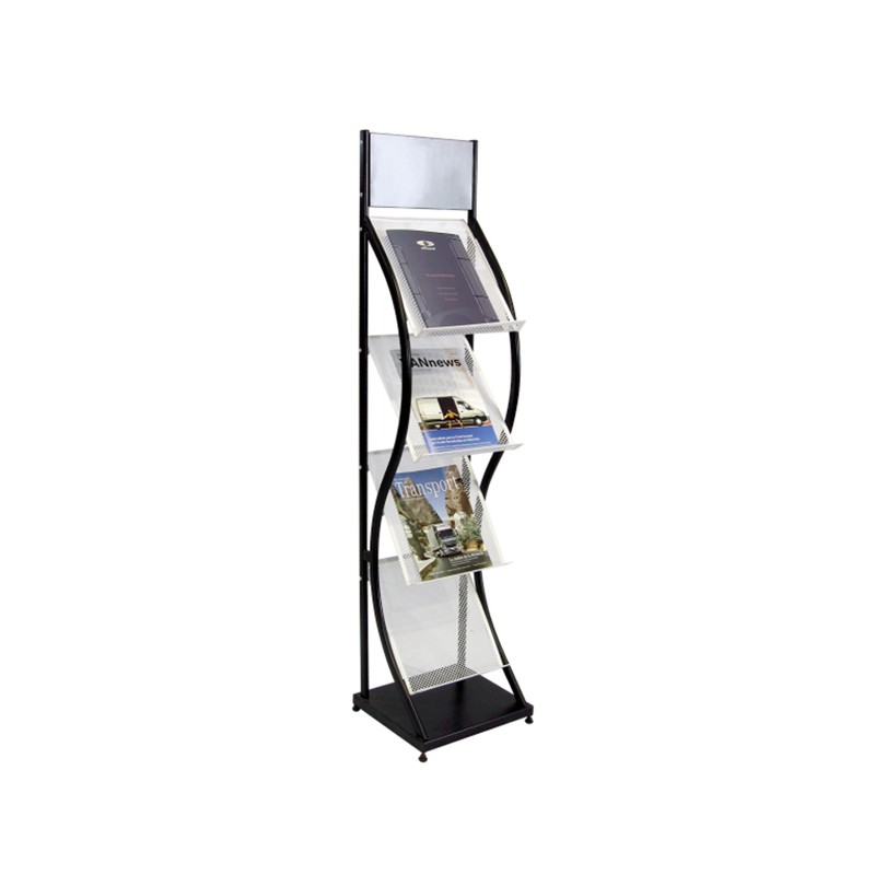 El expositor dispone de 4 niveles para presentar cualquier tipo de revista o folleto. Está pintado en color negro con las bandejas en color blanco. Resulta ideal para colocar pegado a una pared o columna.