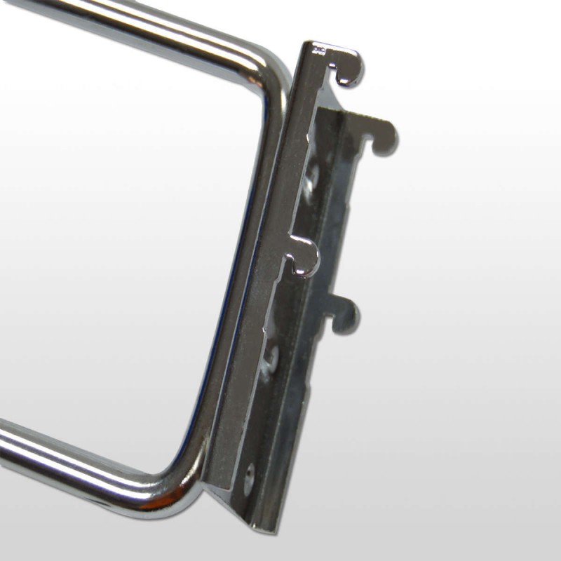 Nuestros ganchos para panel perforado están fabricados en hierro cromado y encajan perfectamente en cualquier panel perforado con orificios de 4 mm y una separación entre ellos de 25 mm.