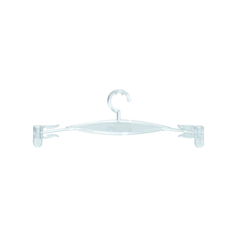 Percha especialmente pensada para presentar lencería. Está fabricada en plástico transparente y cuenta con pinzas en los extremos.