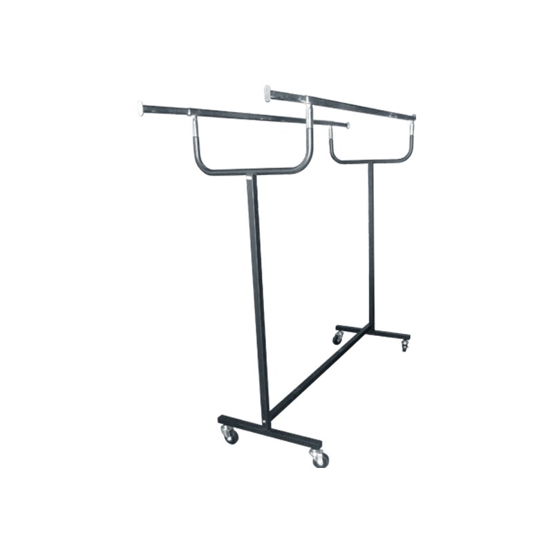 Perchero metálico con dos brazos extensibles y ruedas.