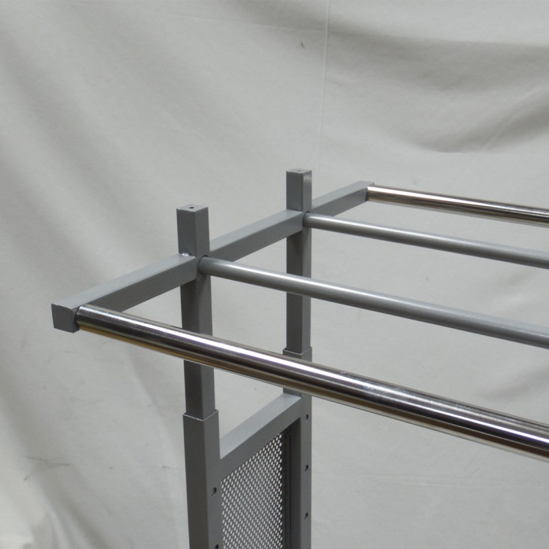 El perchero es regulable en altura hasta 159 cm y cuenta con 4 barras para colgar.
