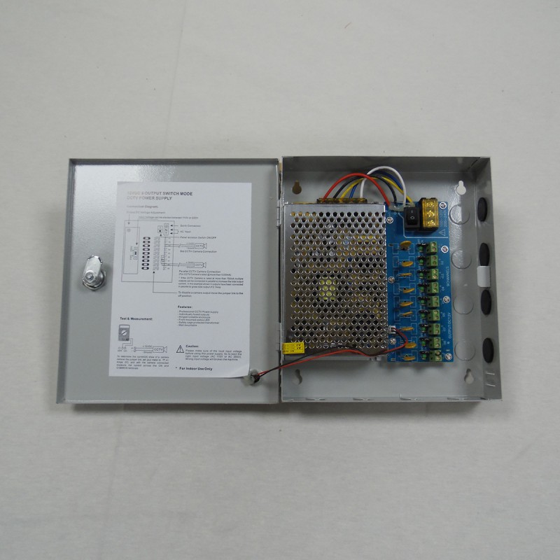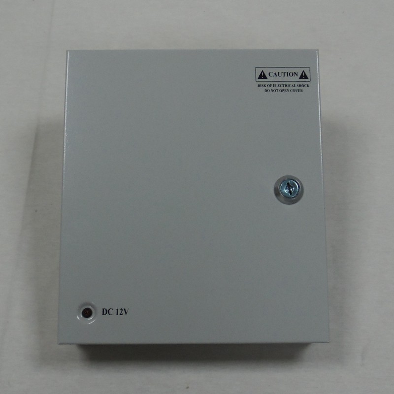 Dispone de una entrada de 220V y 9 salidas de 12V, aunque es posible conectar hasta 4 cámaras en cada salida (un total de 36 cámaras).